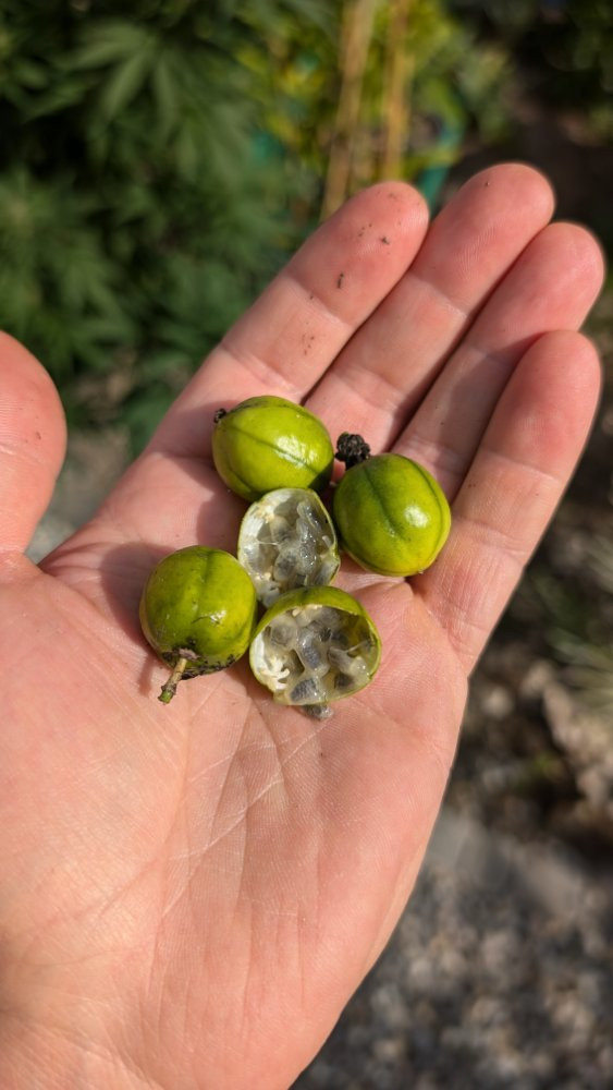 Sehr viel intensiver als der der Wilden Pflanzen denen ich bis jetzt im Urlaub begegnet bin. Die Früchte riechen sehr angenehm, intensiv exotisch und tatsächlich nach Passionsfrucht. Die Schale ist Papierdünn. Wenn man sie öffnet kommt eine weiße Pulpe zum Vorschein in die schwarze Kerne gebettet sind. Saugt man die Pulpe aus ist das erste was man wahrnimmt ein intensiver süßer Zuckermelonengeschmack, gepaart mit einem leider nicht ganz so angenehmen Klebstoff-Geschmack, dann wandelt sich der Geschmack und es kommt eine angenehme Säure mit ins Spiel. Die Samen geben dem Ganzen einen interessanten Crunch. Ob man das jetzt mag ist wohl Geschmackssache, ich finde sie jedenfalls nicht schlecht, auch wenn mich der Klebstoffgeschmack etwas stört. Die Früchte selbst sind winzig. Gerade mal so groß wie kleine Trauben, aber es sind sehr sehr viele. Ich denke ich werde die Pflanze wieder anbauen.