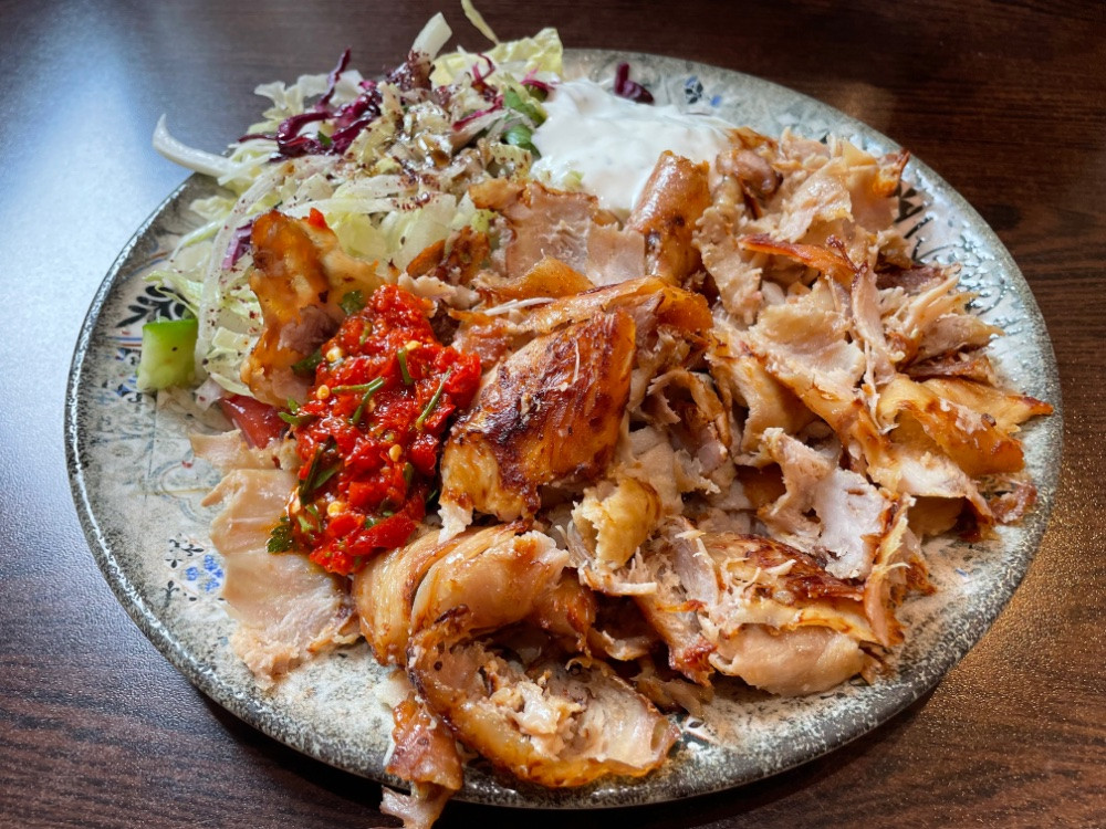 Heute Mittag haben Thomas und ich uns einen Teller Hühnerfleischdöner und Salat geteilt. Das Salatdressing war super: Granatapfelmelasse, Olivenöl und Sumach.