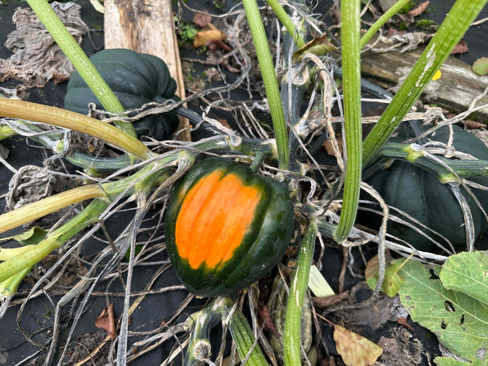 Dieses Jahr wieder einen Eichelkürbis im Garten gehabt, einen "Acorn". Das sind nicht allzu lang haltbare kleine Kürbisse der Art cucurbita pepo, andere pepo sind z.B. Sommerkübisse (=Zucchini), Ölkürbisse, Dumplings (teilweise recht lecker, aber auch klein und dünnfrüchtig), Spaghettikürbis, Patissons und viele mehr. Hatte früher mal einen "Honey Bear", diesmal "Autumn Delight". Hoher Ertrag. Da ist er, einer umgedreht damit man die orange schöne Auflageseite sieht: