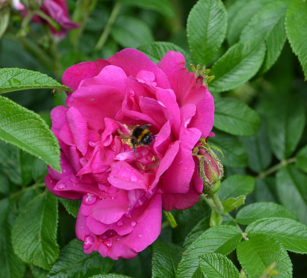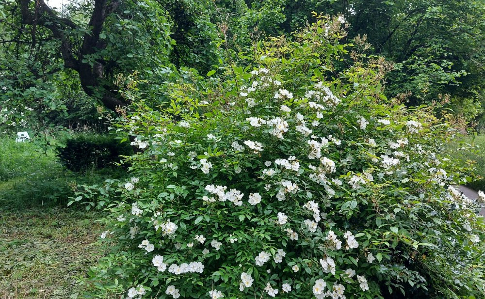 Sie steht hier frei in der Wiese, wird seit Jahren nicht pflegerisch angerührt und ist von Juni bis Herbst nie ohne Blüten. Gleichzeitig entwickeln sich die kleinen Hagebutten in Büscheln, die sehr zierend sind und lange in den Winter hinein halten, wenn sie nicht für Adventsdeko geplündert werden.