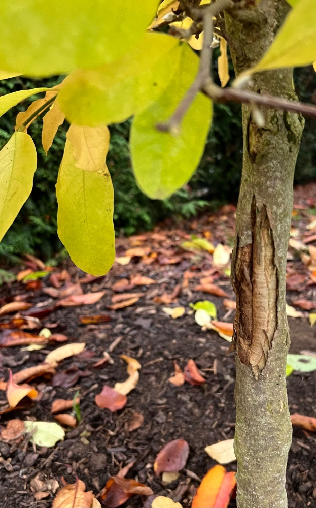 Stimmt. Bei der Birke könnten es Hornissen gewesen sein. Beim Ahorn verdächtige ich nach wie vor einen Rasentrimmer. Bei der Magnolie könnte ein abgerissener Zweig die Ursache für die Narbe sein.