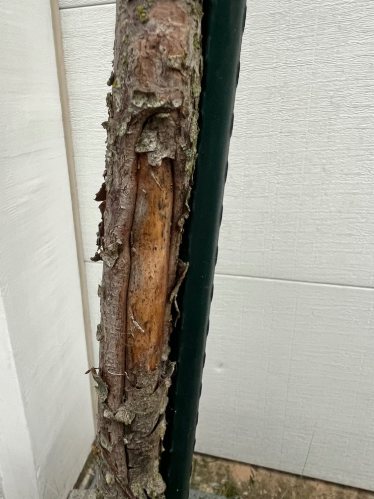 Aber als ich gestern gesehen habe, dass die Magnolie auch so eine Wunde hat, bekam ich Zweifel, ob es nicht eine Katze oder ein Nagetier gewesen sein könnte, da es bei der Magnolie nicht auf der Sonnenseite ist.