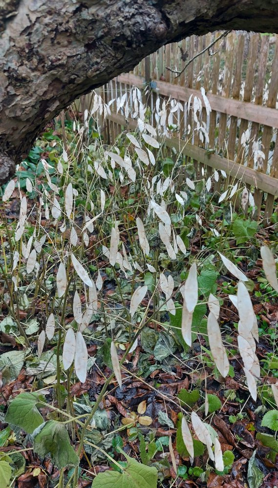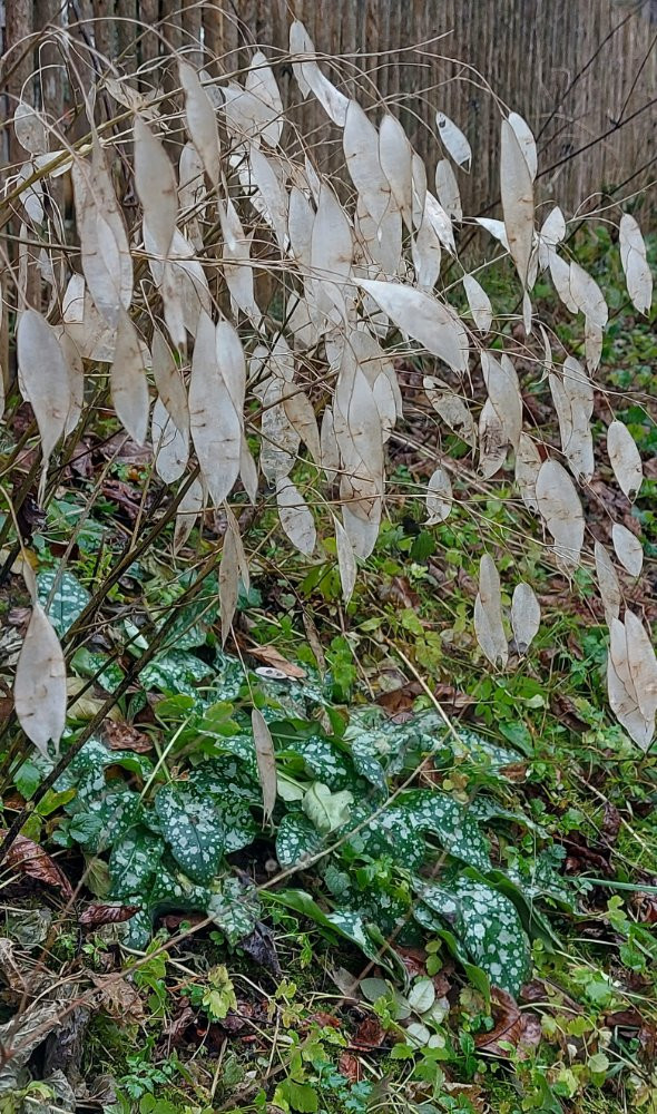 Lunaria rediviva stehen oft bis Januar (innerhalb des Zauns, außerhalb werden sie gerne von den Leuten mit den Neubau-Sterilgärten zur Adventsdeko abgepflückt