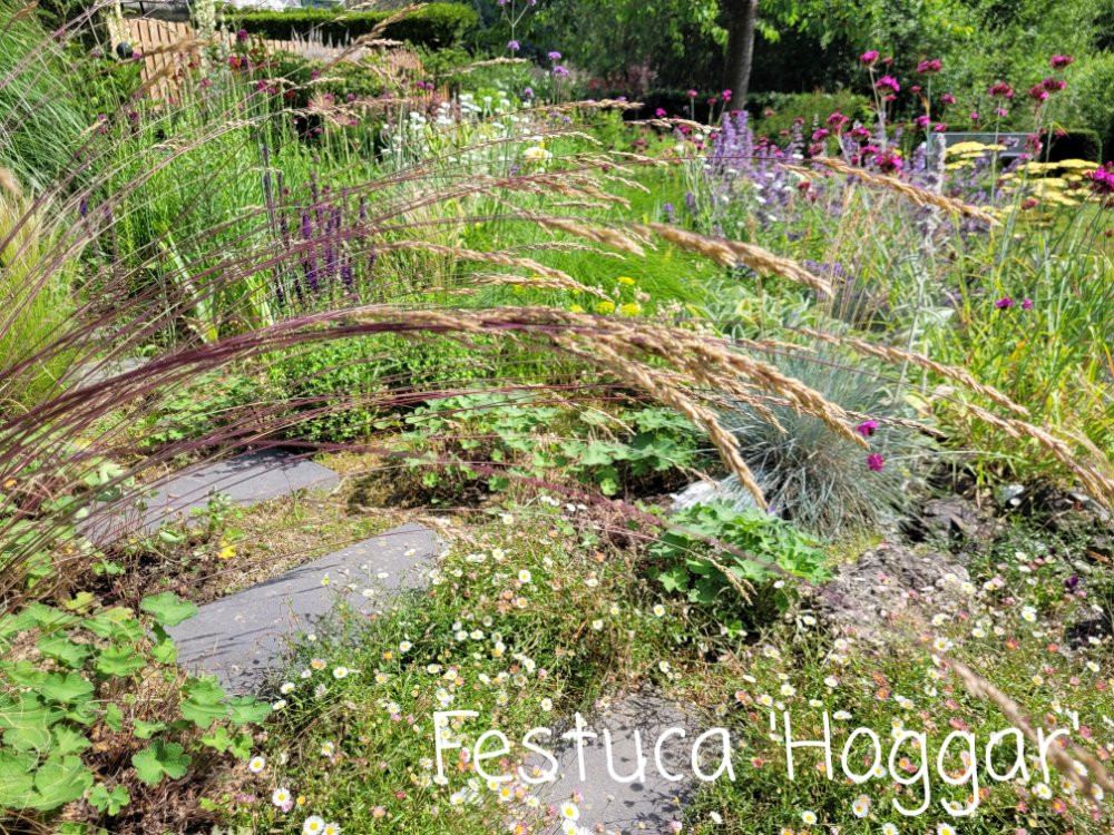 Oder Festuca 'Hoggar', eher Blaugrün mit weit überstehenden Blütenähren auf schlanken Halmen.