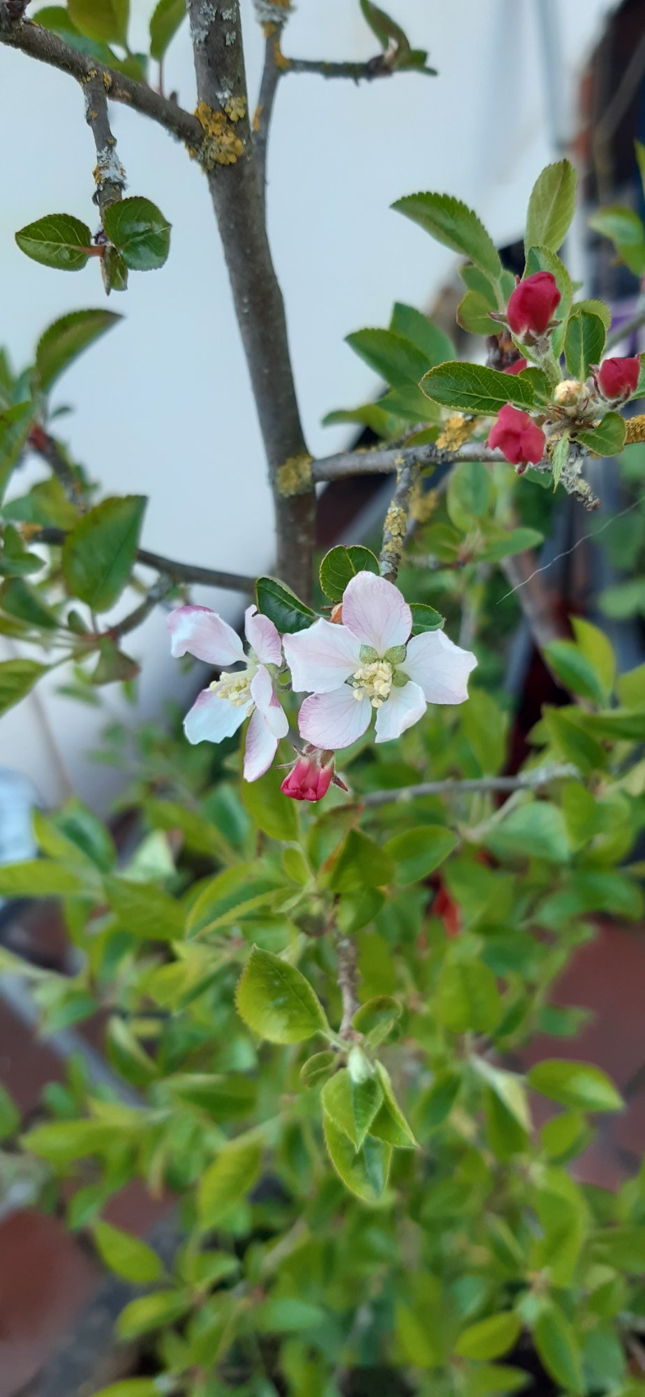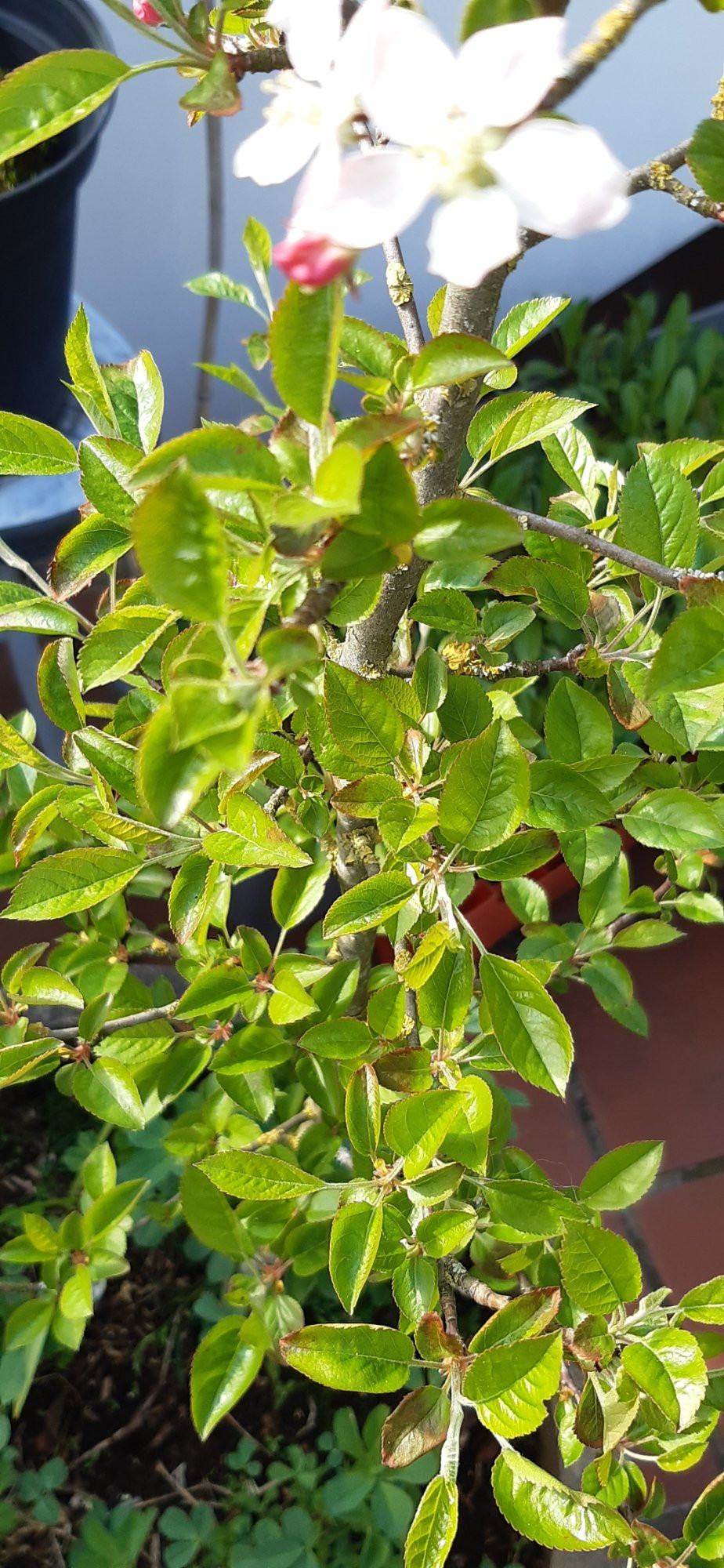 Werde im nächsten Jahr sehen, ob wieder Blüten dran sind, die sich dann sogar weiter zu kleinen Äpfeln entwickeln. Zumindest war es für mich im Ganzen eine schöne Beobachtung des Wachstums.