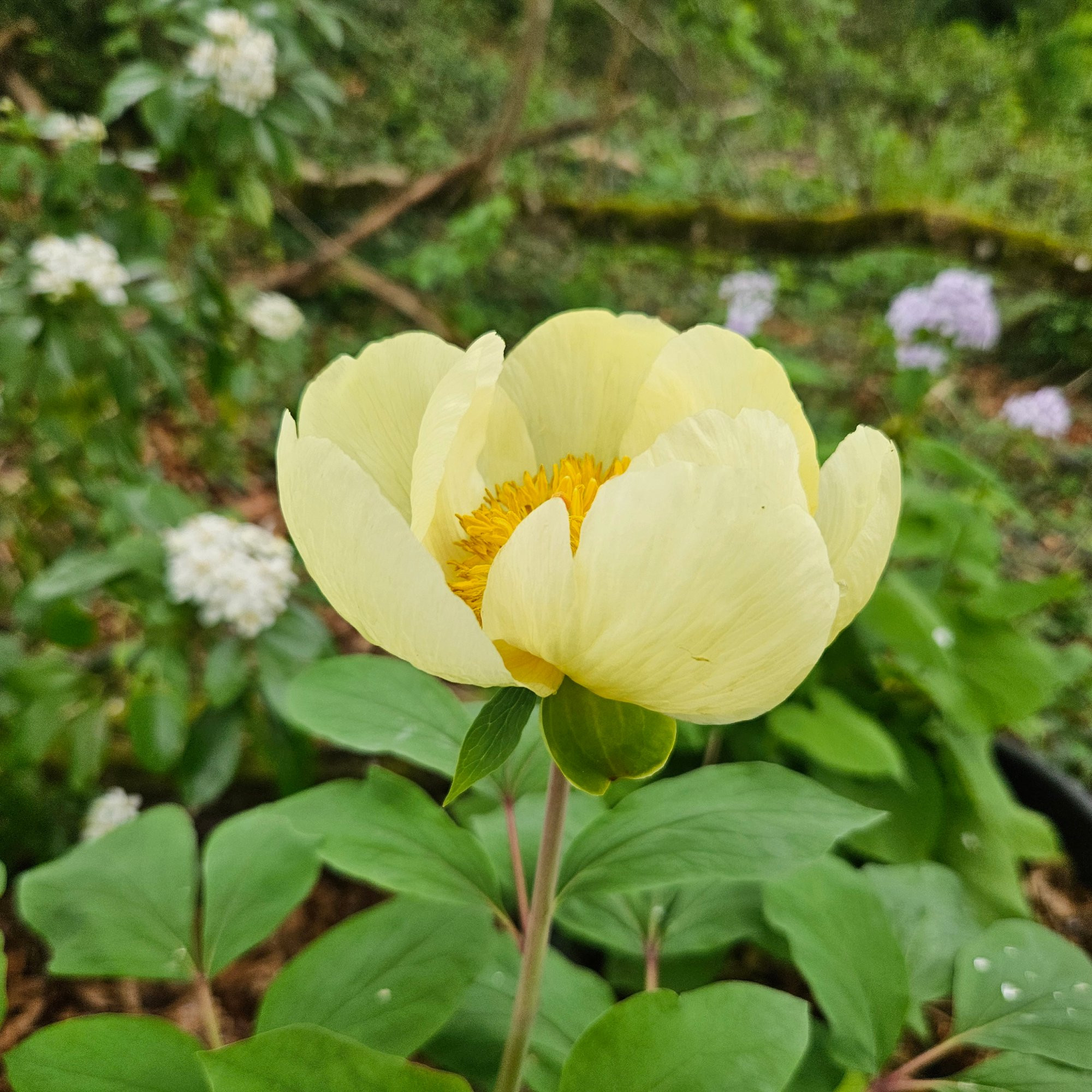 Paeonia mlokosewitschii in der perfekten Farbe vor Lunaria rediviva und Choisya ternata.