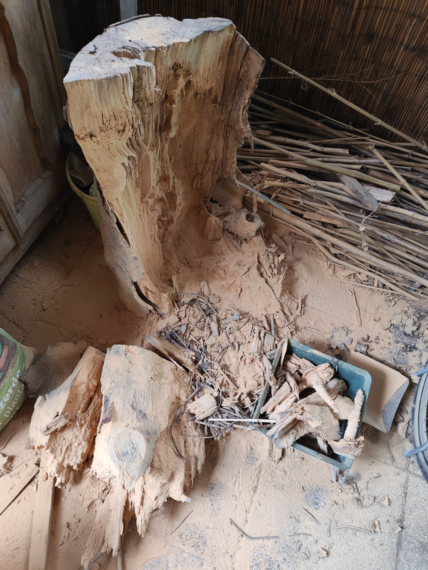 Zu meiner großen Verwunderung hat sich mein Hackstock in gelben Staub verwandelt. Aus dem Stamm einer Coloradotanne würde schierer Staub. Er stand unterm Carport im Freien. Keine Fraßgänge mit "Häufchen davor", nein die Substanz wurde zu 80% Staub. Oder Holzmehl mit feinstem Mahlgrad. Auf dem Teil das noch steht könnte ich noch Spreissel zerkleinern, das Teil ist noch stabil.