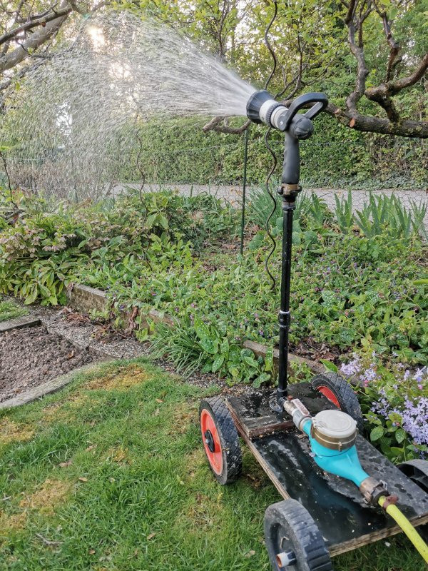 Und deswegen auch das Setup mit der Gekakupplung auf dem Standrohr, damit man flexibel ist und die Verbraucher tauschen kann, je nach dem welcher Garten oder Fläche wie zu bewässern ist und da ists tatsächlich auch kein Fehler, wenn die Wasseruhr, die tatsächlich nur Schwerpunkt für die Stabilität ist, auch mal einen Verbrauch messen kann, wenn irgendwas abgerechnet werden muss. Die müssen nach Eichgesetz eh alle paar Jahre gewechselt werden und gibts deshalb gratis.