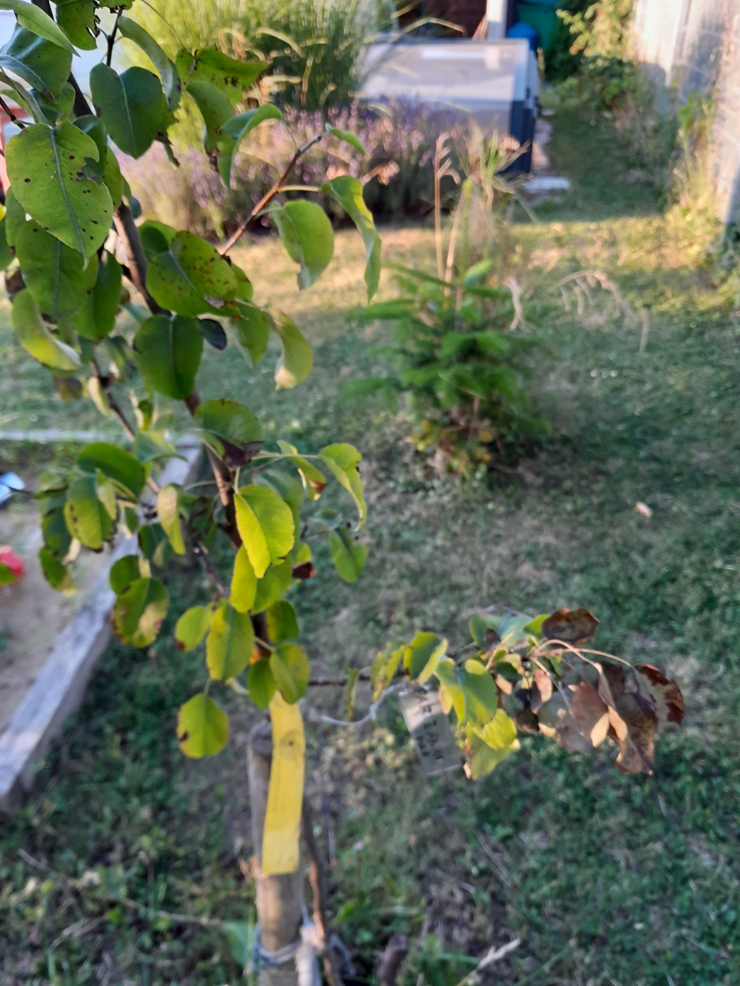 Vielleicht bekommt er auch etwas zu wenig Licht ab, da er in einem Obstgarten mit rundherum bereits größeren Obstbäumen, darunter Birnen, steht. Also der Boden sollte eigentlich passen.
