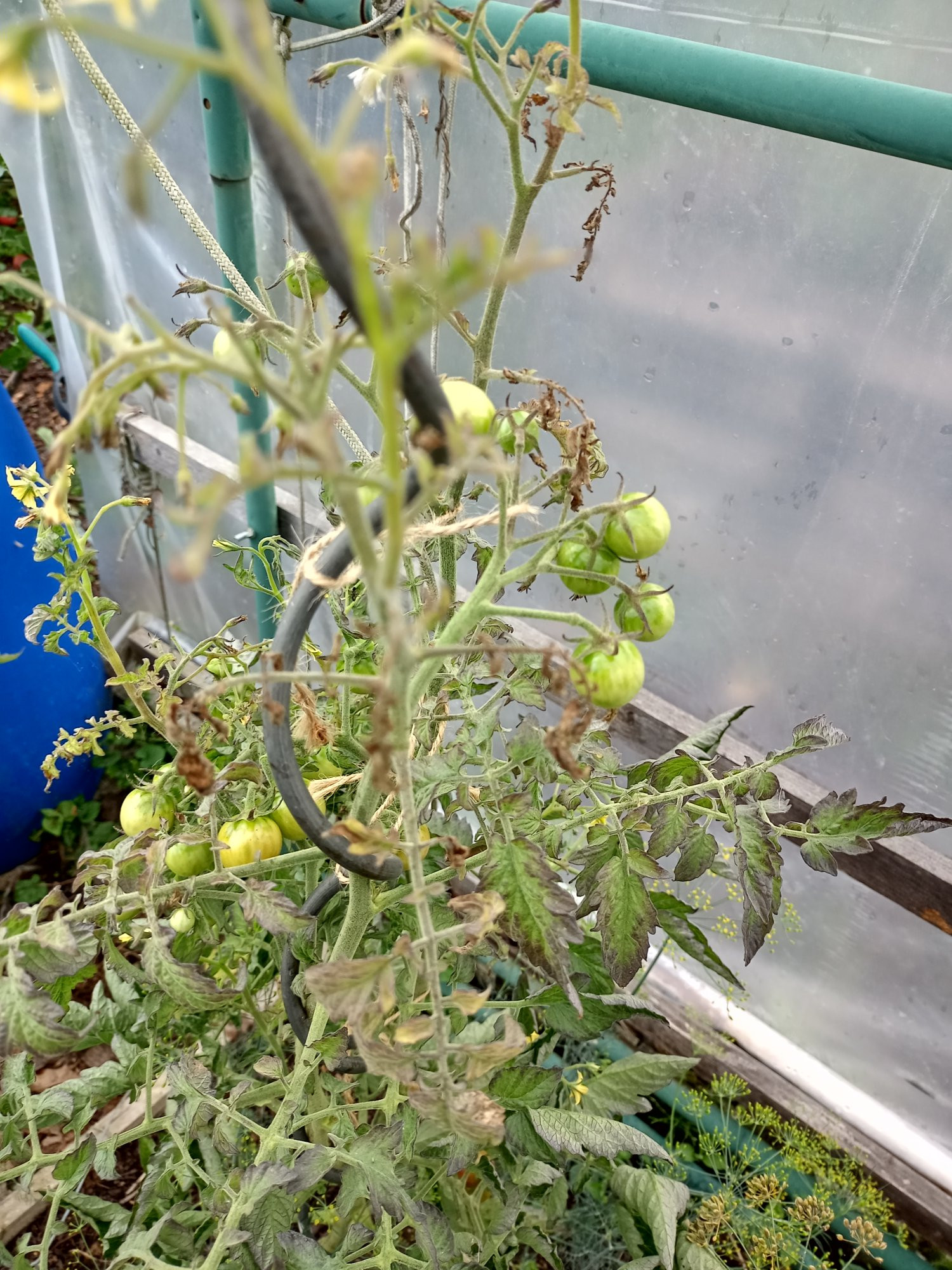 Antitau hatte ich vor Jahren aber das ist eine normale Gewächshausfolie die für ca. 5 Jahre ausgelegt ist. Das würde aber auch nicht erklären warum links die Tomaten im Raised Bed gut wachsen. Einzelne Tomaten in der 6m Reihe sehen nicht so übel aus. Teils sind die Pflanzen mit Dill, Tagetes und Neuseeländerspinat unterpflanzt. Auf der linken Seite fast nur Kapuzinerkresse. Daran kann es wohl auch nicht liegen. Und dabei habe ich dieses Jahr extra zwei Pflanzen weniger in der Reihe gesetzt damit genug Platz ist.