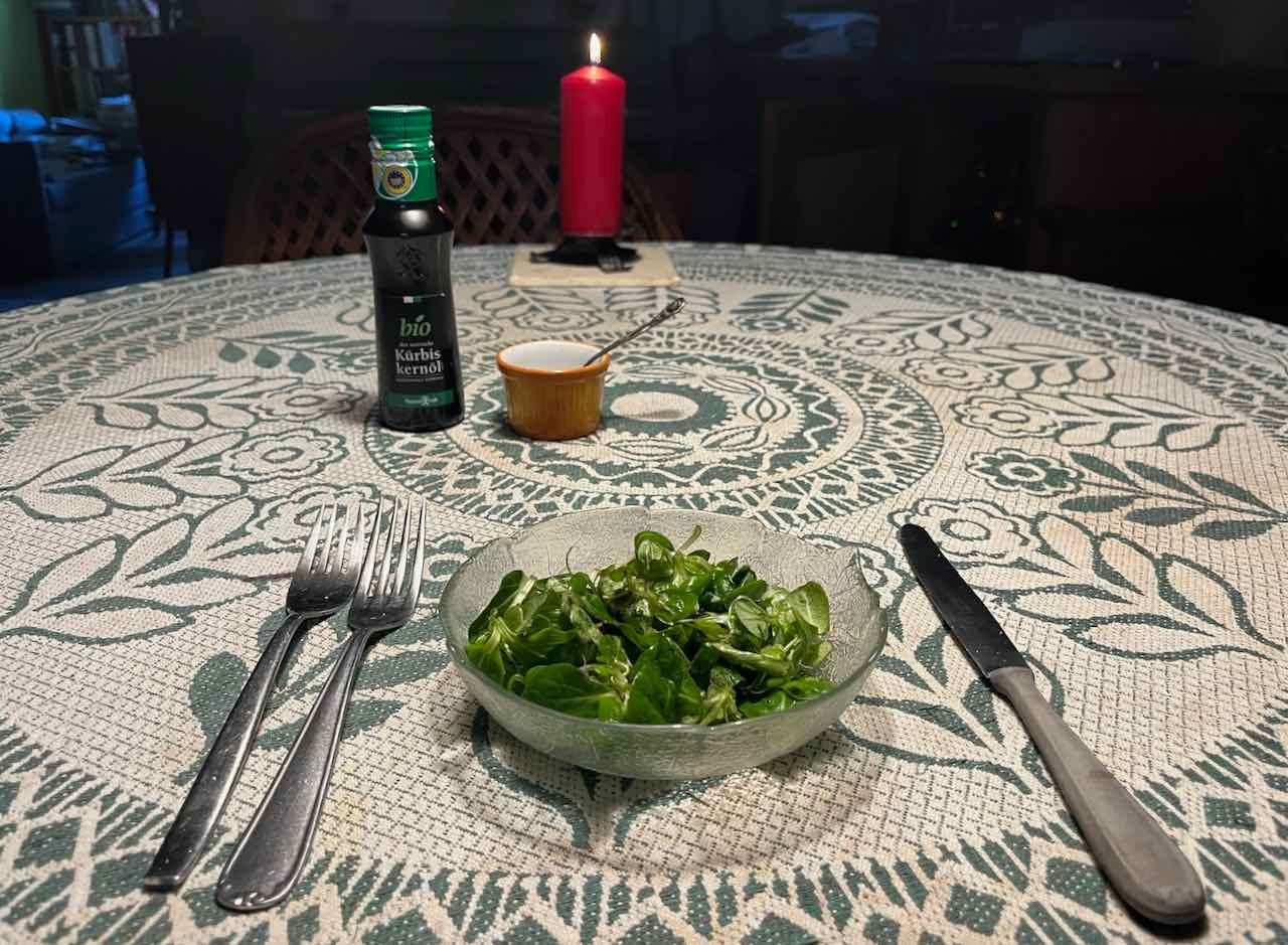 Vorspeise Vogerlsalat, Hauptgericht Mini-Paprikas gefüllt mit Zwiebeln, Kartoffeln und Champignons, im Ofen gebacken zum Saperavi 2017 aus Georgien