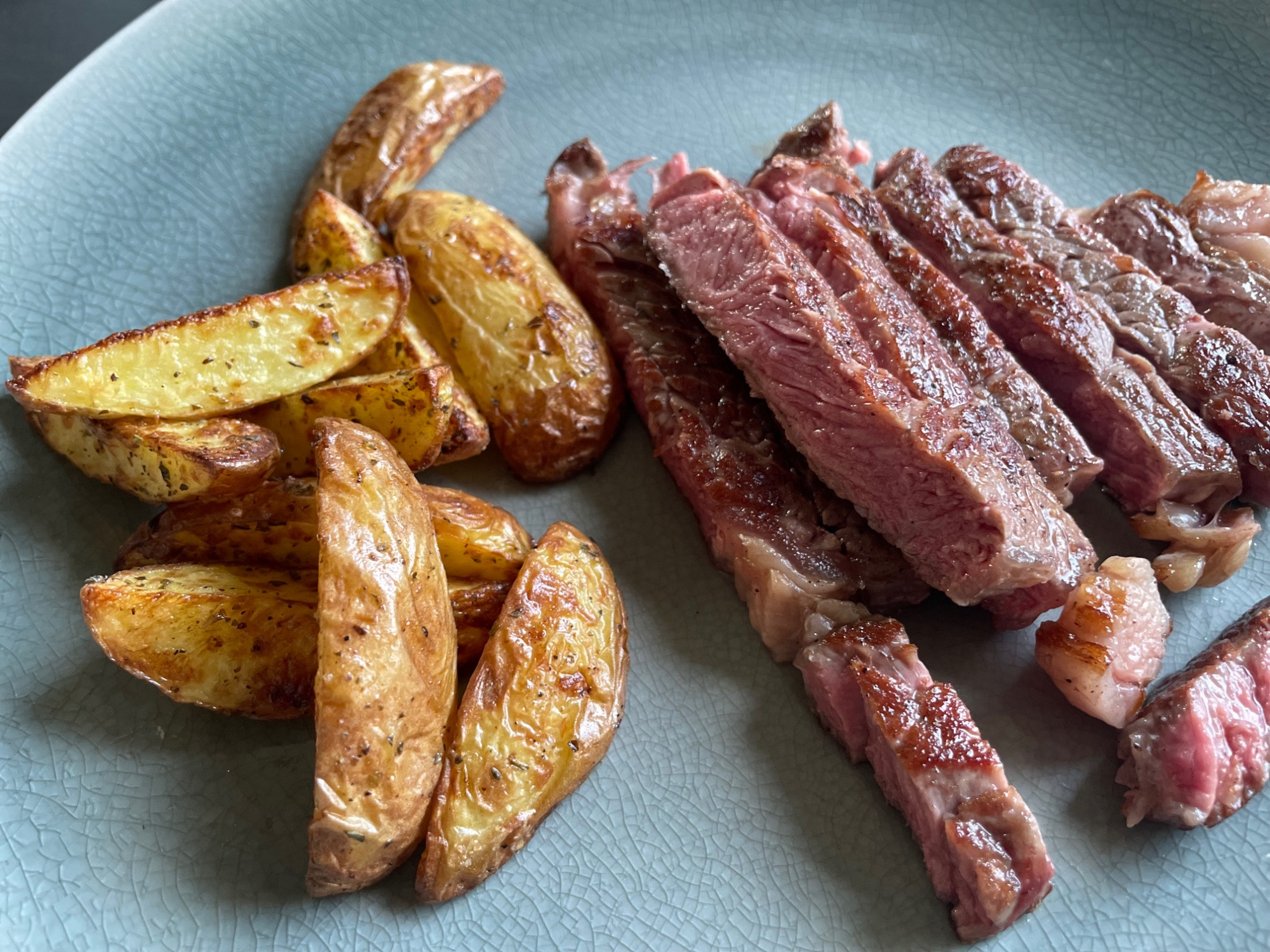 Bei uns gab es vorweg Steinbeissertartar auf Guacamole und danach Steak mit Kartoffelvierteln aus dem Airfryer.