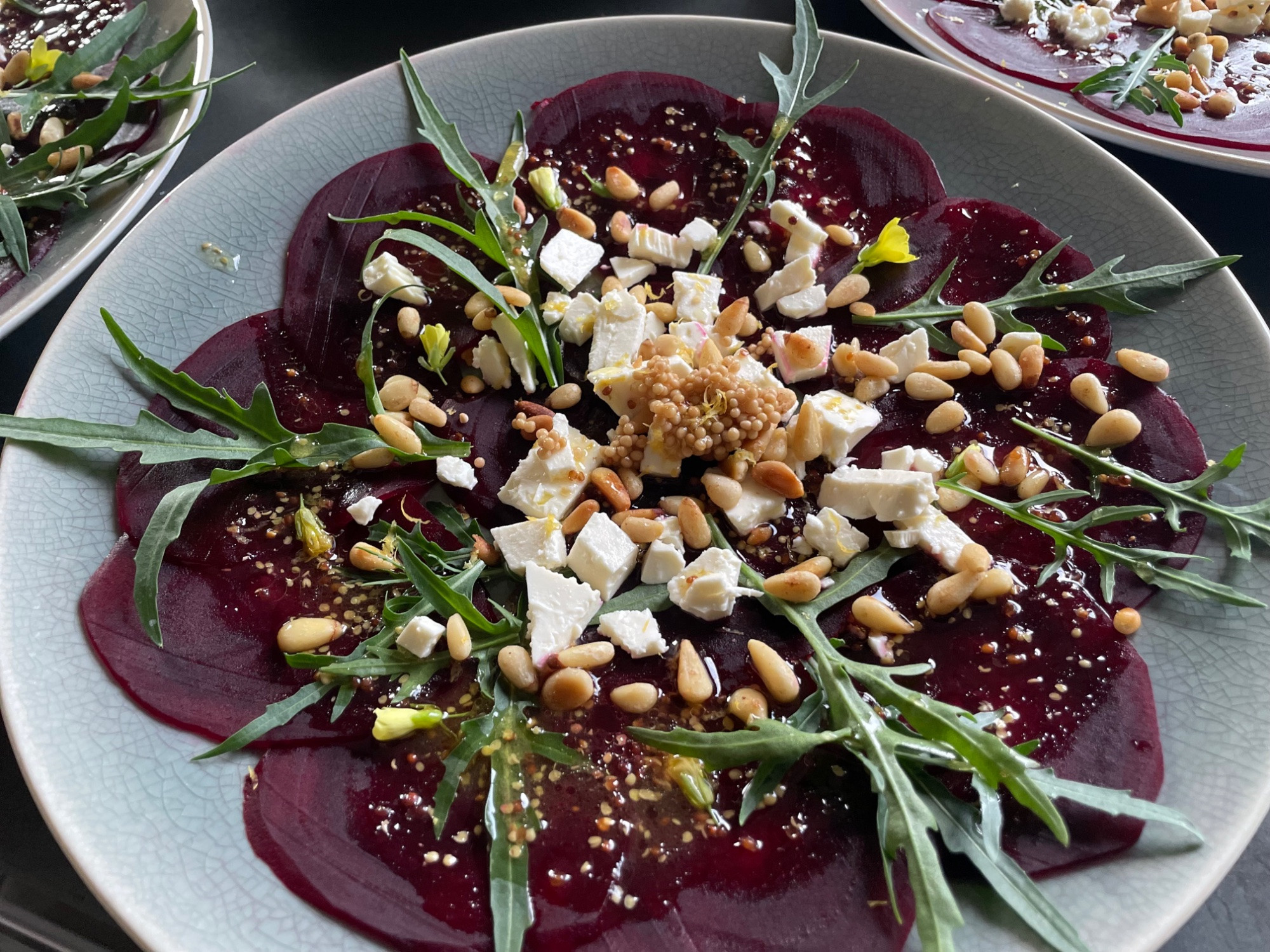 Carpaccio von Rote Bete mit Schafskäse, Pinienkerne und gepickelten Senfkörnern.