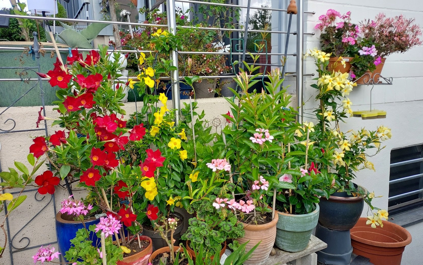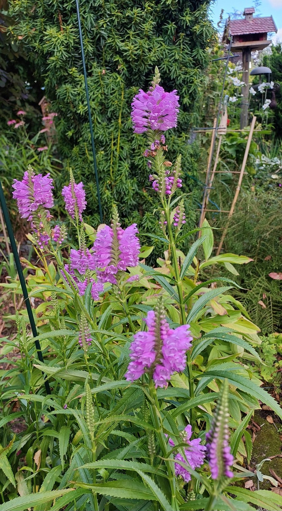Nun blüht auch Physotegia. Und noch viele Kübelpflanzen. Eine überwinterte Dipladenia kriegt jetzt erst Knospen. Ob das noch was wird?