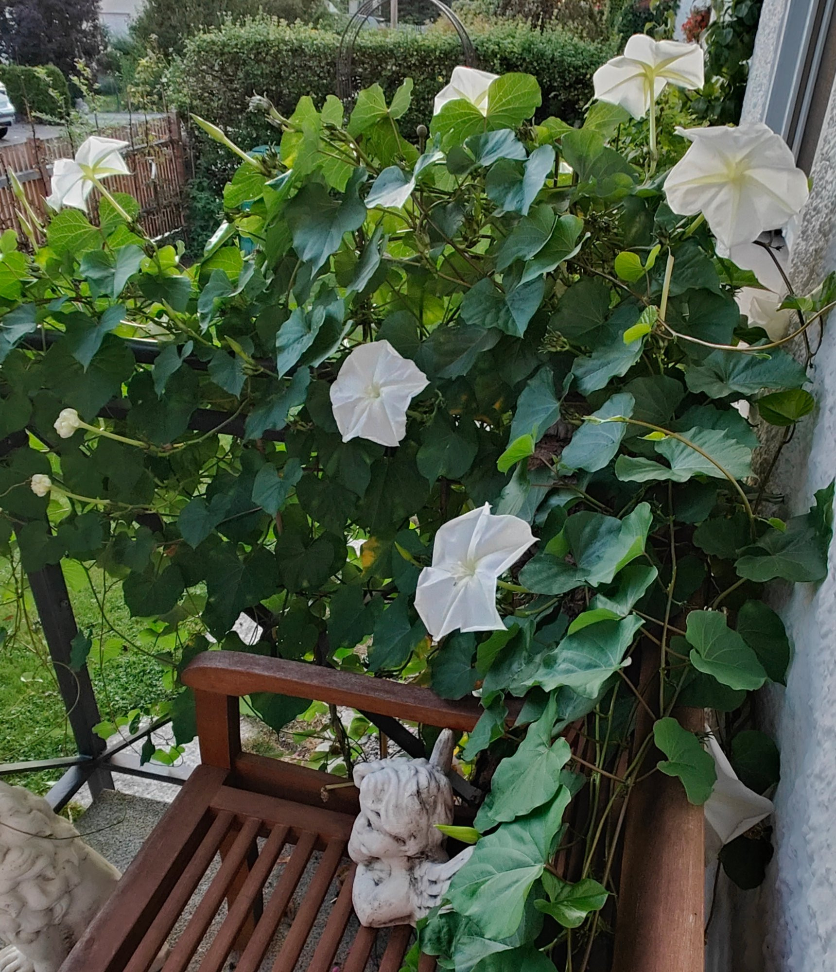 Die Nordseite bekommt der Mondwinde gut und wenn es kühler ist, halten die Blüten viel länger