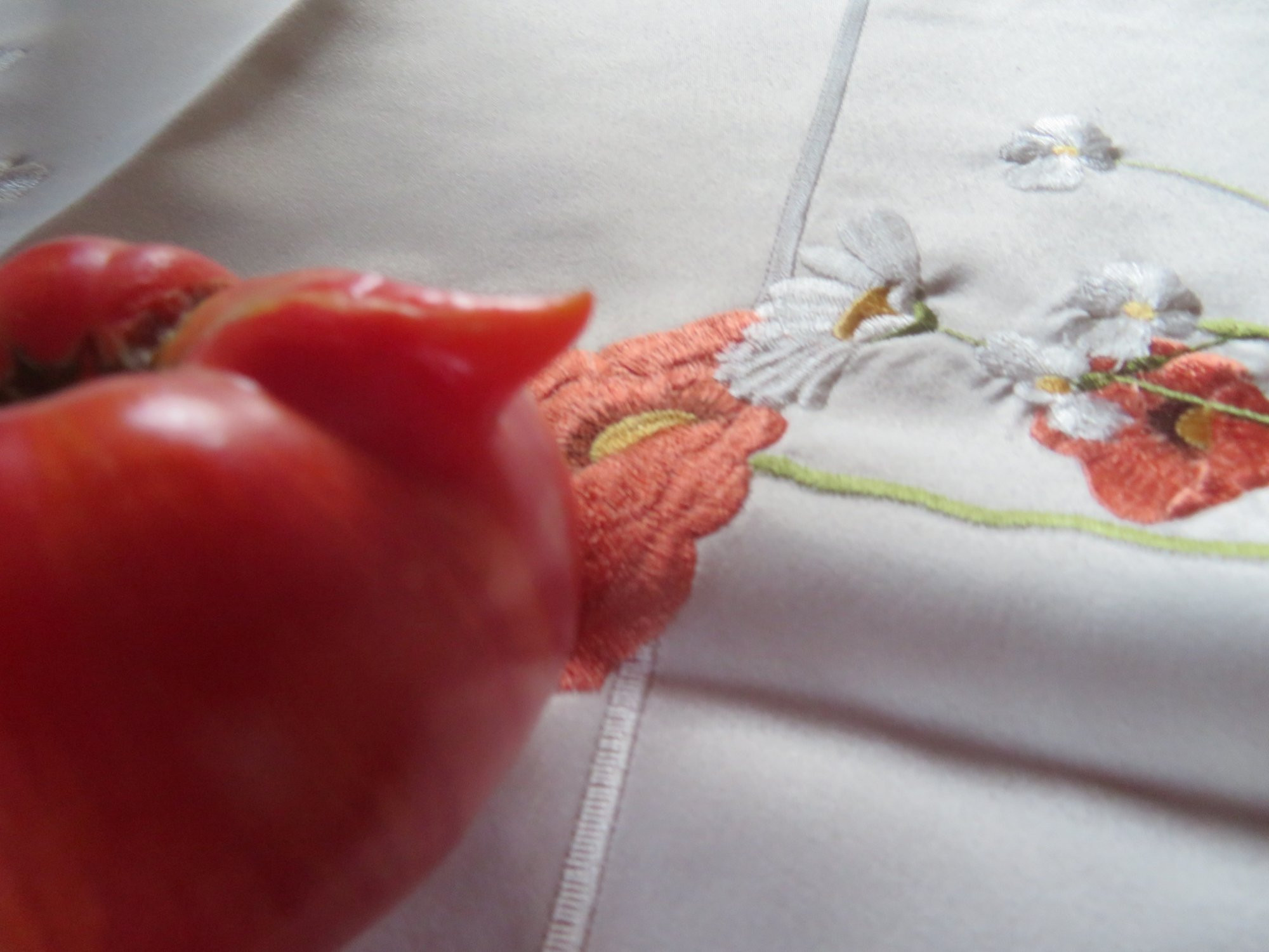 Die Frucht habe ich mit Tomatenblättern als Hintergrund hervorgehoben. Nun meine Frage, was für eine Frucht bin ich? Es ist kein Schmetterlingskürbis.