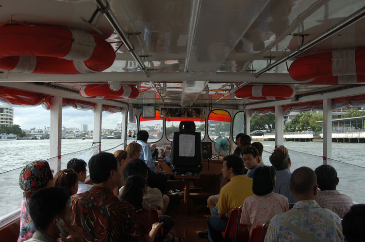 Bangkok liegt an einem großen Fluss, dem Menam Chayo Praya. Hier fahren wir auf einem Expressboot ...