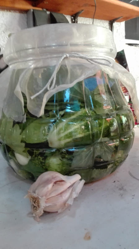 Obenauf habe ich Meerettichblätter gelegt und ein Tellerchen zum beschweren und ein feines Tuch drüber,damit keine Tiere rein kommen, 4 Tage stehen lassen und dann kann man schon die ersten probieren,