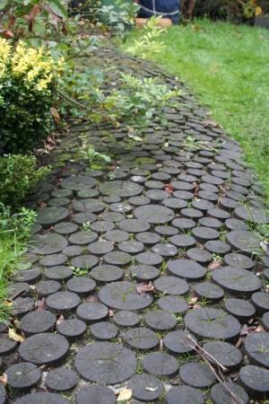 ...und hier unser inzwischen schon 14 Jahre alte Holzweg, der von meinem Mann in einem Anfall von Jätwahn komplett von Wildkräutern befreit wurde. Leider hat er dabei auch das das Holzpflaster befestigende Erdreich entfernt: jetzt sehen die Stummel aus wie paradontöse Zähne!