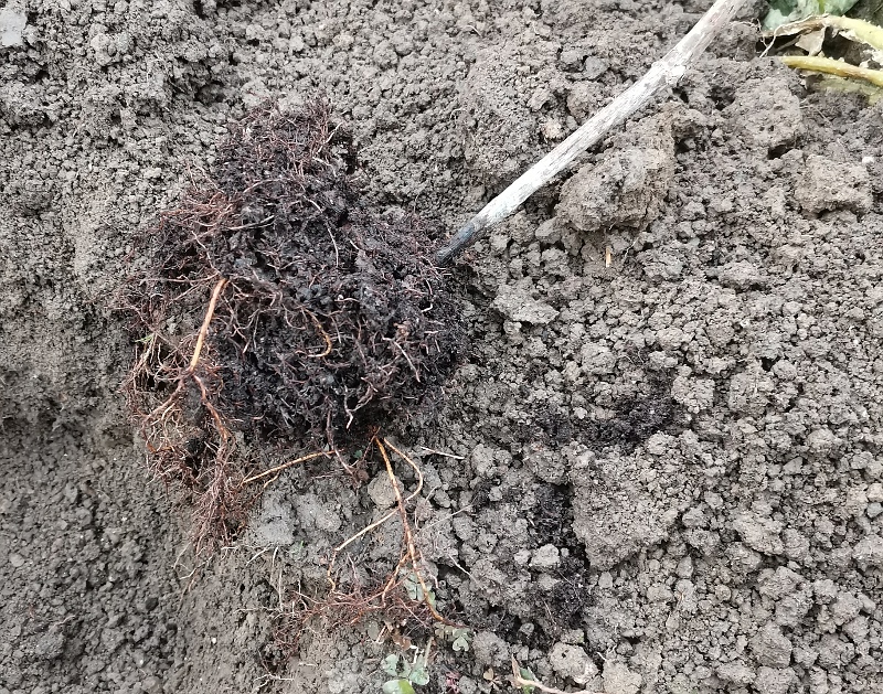 Anbei eine Tafeltraube, die im Container gewachsen ist. Der Wurzelballen muss aufgelöst werden.