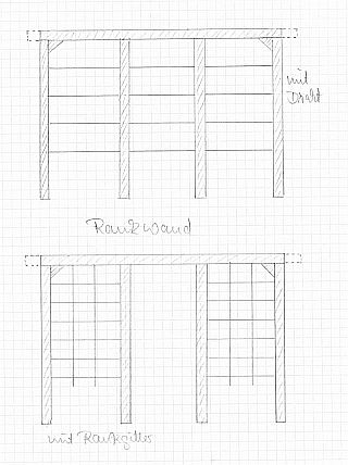 Sag doch mal wie lang die Zaunpfosten sind und wieviele hast du von ihnen und den Dachlatten? Eventuell könnte ich dir später mal was 'malen'.Um zu verhindern, dass eingegrabenes Holz schnell wegrottet, kann man es vorher ankokeln. Das klappt ganz gut.
