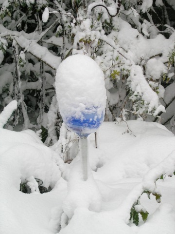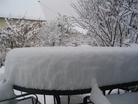 daher ist die Schneedecke auch mindestens 30 cm (die habe ich auf dem Gartentisch gemessen). Obwohl Hunde den Schnee liiiieben, ist es unserem heute doch zuviel.