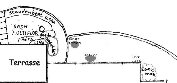 Hier die Vergrößerung des Rosenbeetsdas sind im Moment 1,5m x 4m, es könnte bis auf 2m x 6m ausgeweitet werden.